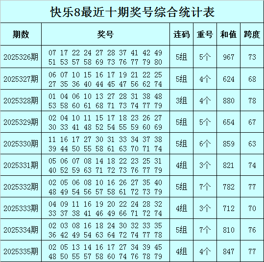 福彩欢娱8第2025335期开出奖号:02 05 13 14 16 17 27 34 39 45 48 50 55 57 58 60 74 76 78 79体育集锦,其中奖号和值为847,跨度为77,包含4个重号02、16、74、78,包含连码13 14、16 17、57 58、78 79。