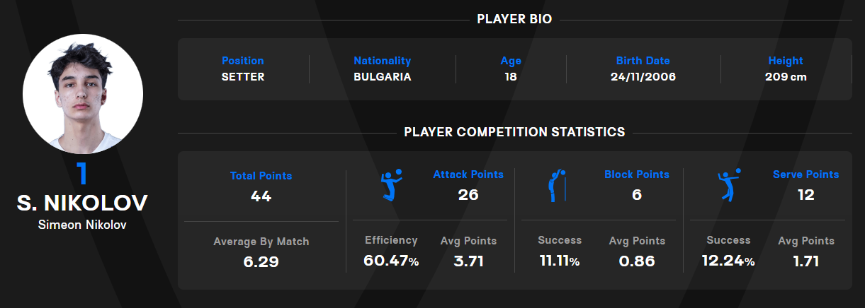 天然最终缺憾1-3夺得银牌,然而也一样醒目排坛,而在这匹黑马的冲锋声威中,年仅18岁的二传天才西蒙·尼科洛夫(Simeon Nikolov),亦然全场戒备的中枢东说念主物之一。