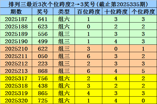 末位跨度分析:前3期末位奖号为1-3-6,最近两期末位奖号跨度为2、3,末位奖号跨度历史上纠合两期开出2、3的景色共183次,其最近两次奖号为: