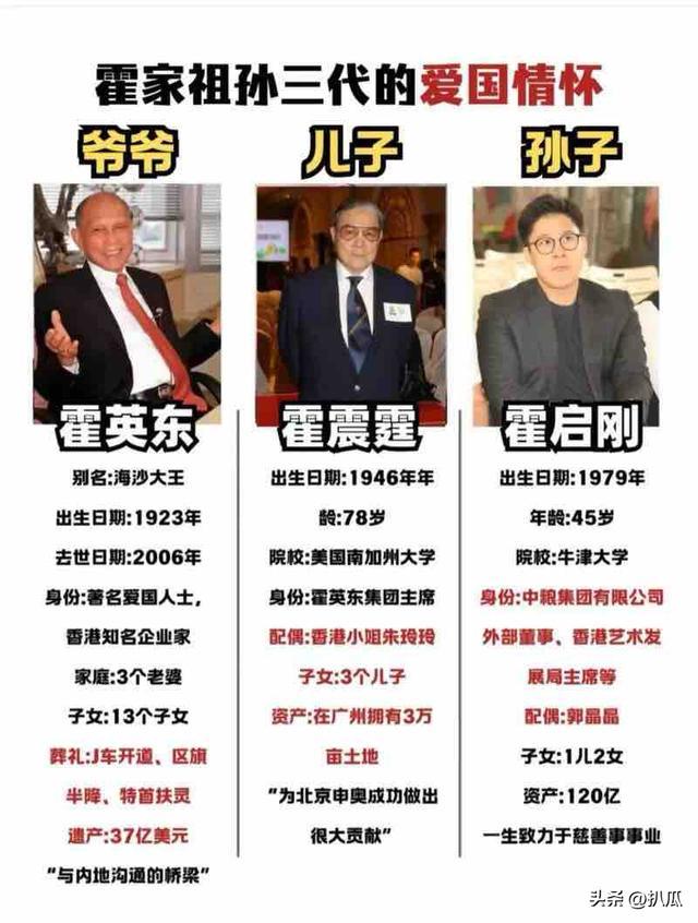 霍氏家眷的缔造者也便是霍启刚的爷爷名叫霍英东,他诞生于香港平庸的渔民家庭,家景相等艰苦。